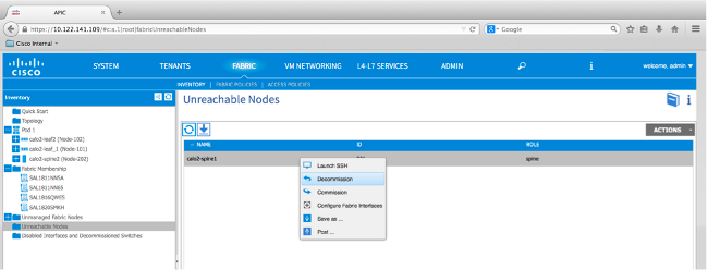 - APIC(Application Policy Infrastructure Controller) GUI에서 Fabric(패브릭) > Inventory(인벤토리) > Unreachable Nodes(연결할 수 없는 노드)로 이동합니다.