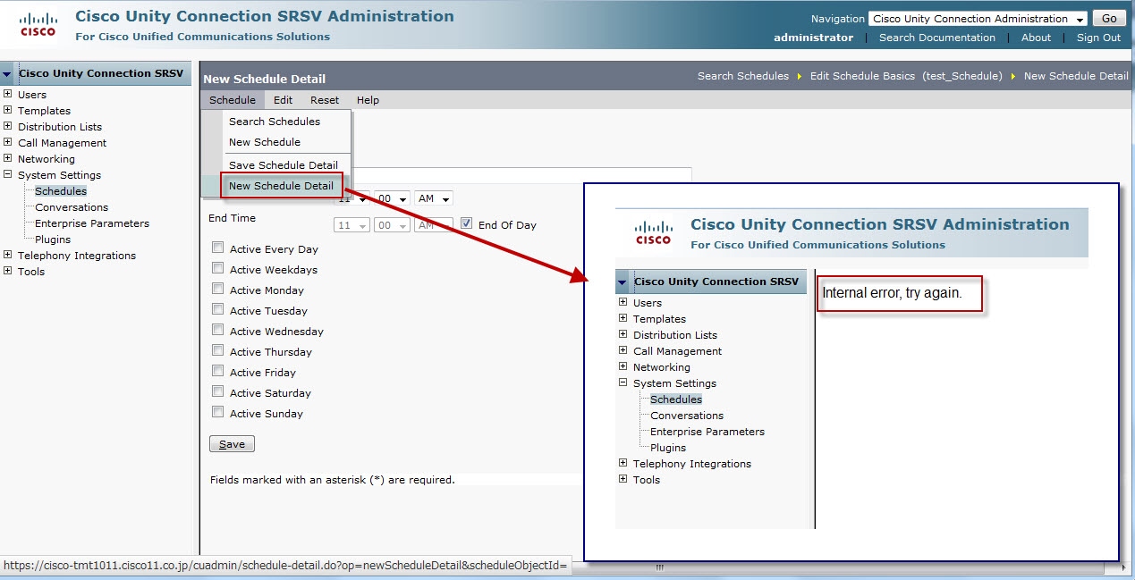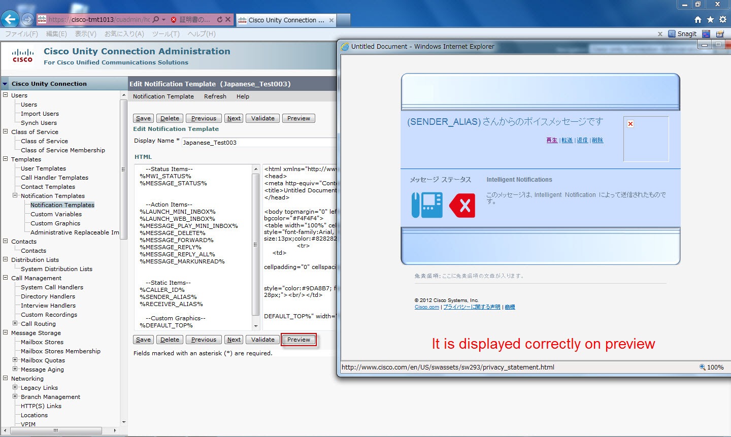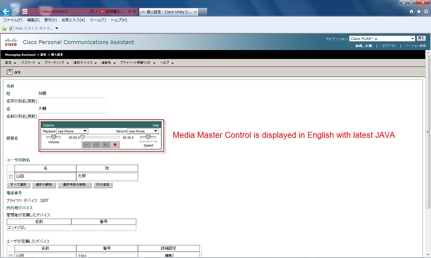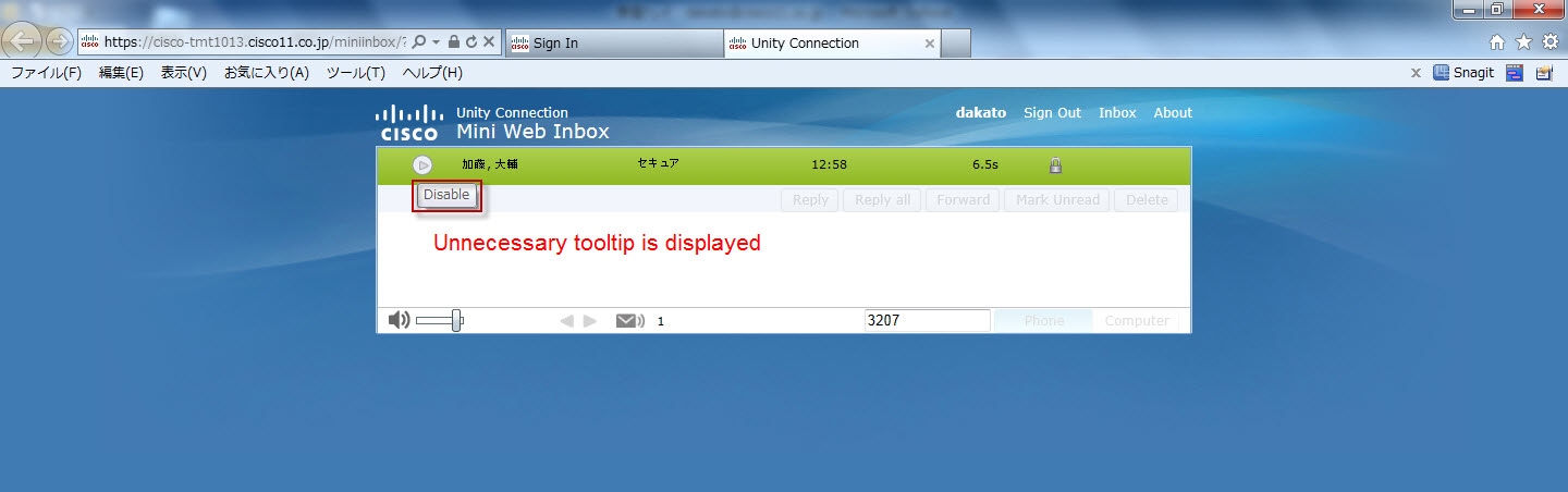 Cisco Unity Connection 10.0(1) 日本語版リリースにあたり、日本語環境で、管理画面や IP フォンのユーザ インターフェイスの実機検証を行いました。 基本的な動作を妨げるような大きな問題は発見されませんでしたが、注意が必要な不具合が見つかっています。 検証中に発見された不具合については、下記の一覧表を参照してください。 なお、この一覧表には、その後のリリースで修正された不具合も含まれています。 また、英語版でも再現する不具合は、参照用のスクリーンショットを英語版で掲載していますが、実際の画面は日本語化されています。