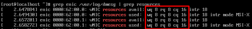 Om de momenteel beschikbare bronnen van de VIC-adapter te controleren, valideert u de verzendings- en ontvangstwachtrijen in het dmesg-bestand: