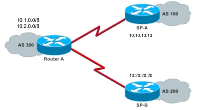 In dat netwerkdiagram worden 10.1.0.0/8 en 10.2.0.0/8 door AS 300 naar buiten geadverteerd.