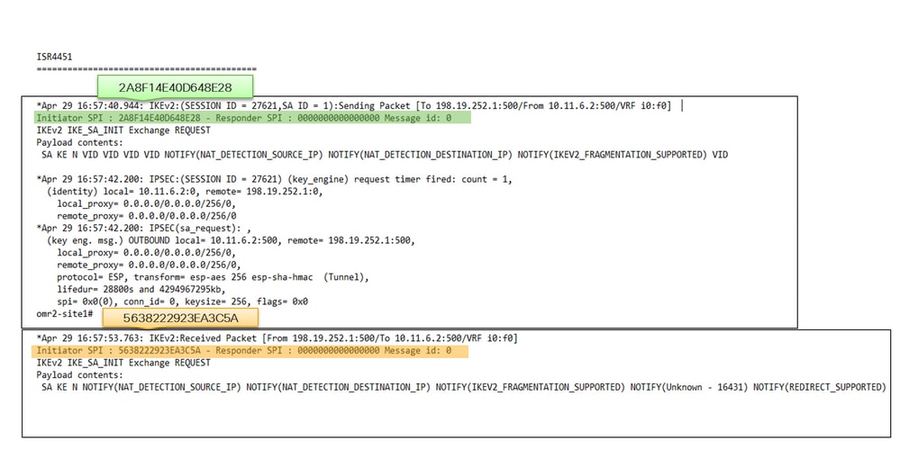 Op de Cisco IOS® XE-platforms kunnen de debugs per tunnel worden gefilterd en kan een voorwaardelijk wachtwoord worden ingesteld voor het externe IP-adres dat is geconfigureerd. De gelijktijdige onderhandelingen worden echter op de logboeken weergegeven en er is geen manier om ze te filteren. Het is nodig om het handmatig te doen. Zoals eerder vermeld, houdt de gehele onderhandeling dezelfde SPI-waarden voor Initiator en Responder. Indien een pakket wordt ontvangen van hetzelfde peer IP-adres, maar de SPI niet overeenkomt met de vorige waarde die wordt bijgehouden voordat de onderhandeling het maximale aantal wederuitzendingen bereikt, is het een andere onderhandeling voor dezelfde peer zoals in de afbeelding wordt getoond: