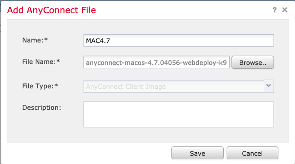 3. Wijs een naam toe aan het AnyConnect-pakketbestand en selecteer het .pkg-bestand vanuit uw lokale systeem zodra het bestand is geselecteerd.