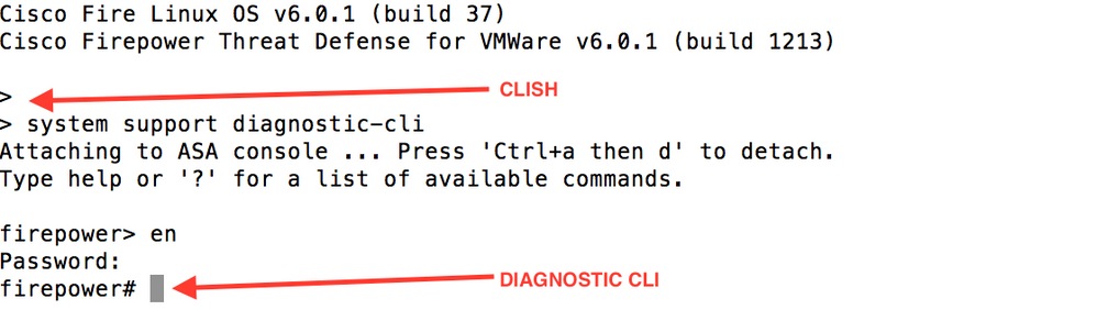 Op FTD-apparaten waarop softwareversie 6.0.1 wordt uitgevoerd, is de ASA diagnostische CLI toegankelijk wanneer u de diagnostische client voor systeemondersteuning invoert. Op FTD-apparaten waarop softwareversie 6.1.0 wordt uitgevoerd, wordt de CLI echter geconvergeerd en worden volledige ASA-opdrachten op de CLISH geconfigureerd.
