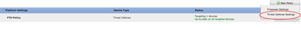 Ofwel bewerk het beleid dat bestaat als je op het potlood-pictogram klikt, ofwel maak je een nieuw FTD-beleid terwijl je op de knop Nieuw beleid klikt en selecteer je type als Threat Defense Settings, zoals in de afbeelding: