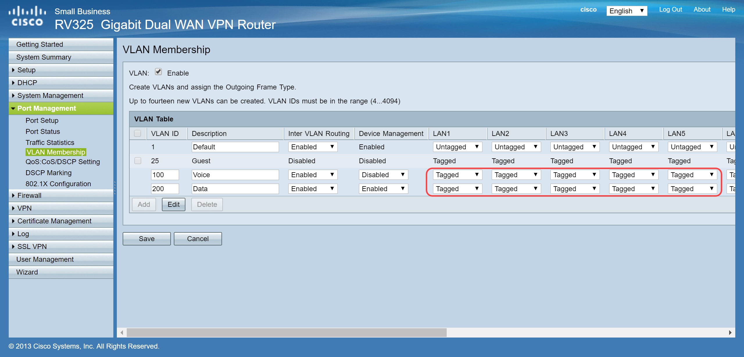 Opmerking: VLAN 100 voor spraak is standaard op deze router gemaakt. Er kunnen maximaal veertien nieuwe VLAN’s worden gemaakt.