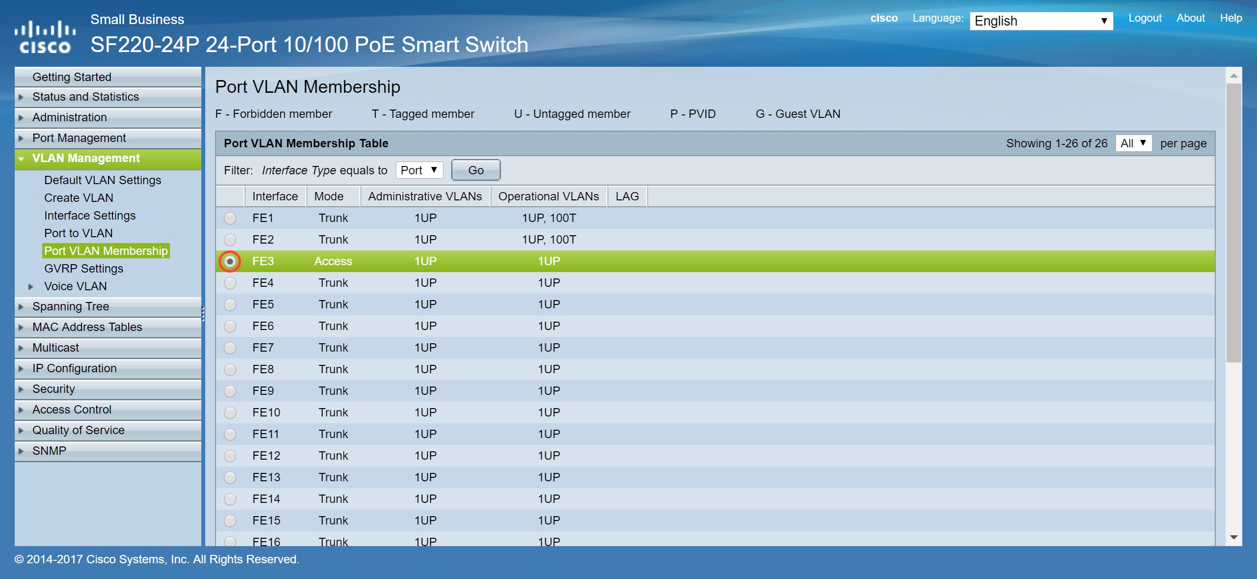 Stap 2. In de Lijst van het Lidmaatschap van Port VLAN, selecteer de interface die u het lidmaatschap van VLAN wilt vormen. In dit voorbeeld zullen we de Raspberry Pi (poort: FE3) configureren om op VLAN 100 te zijn.