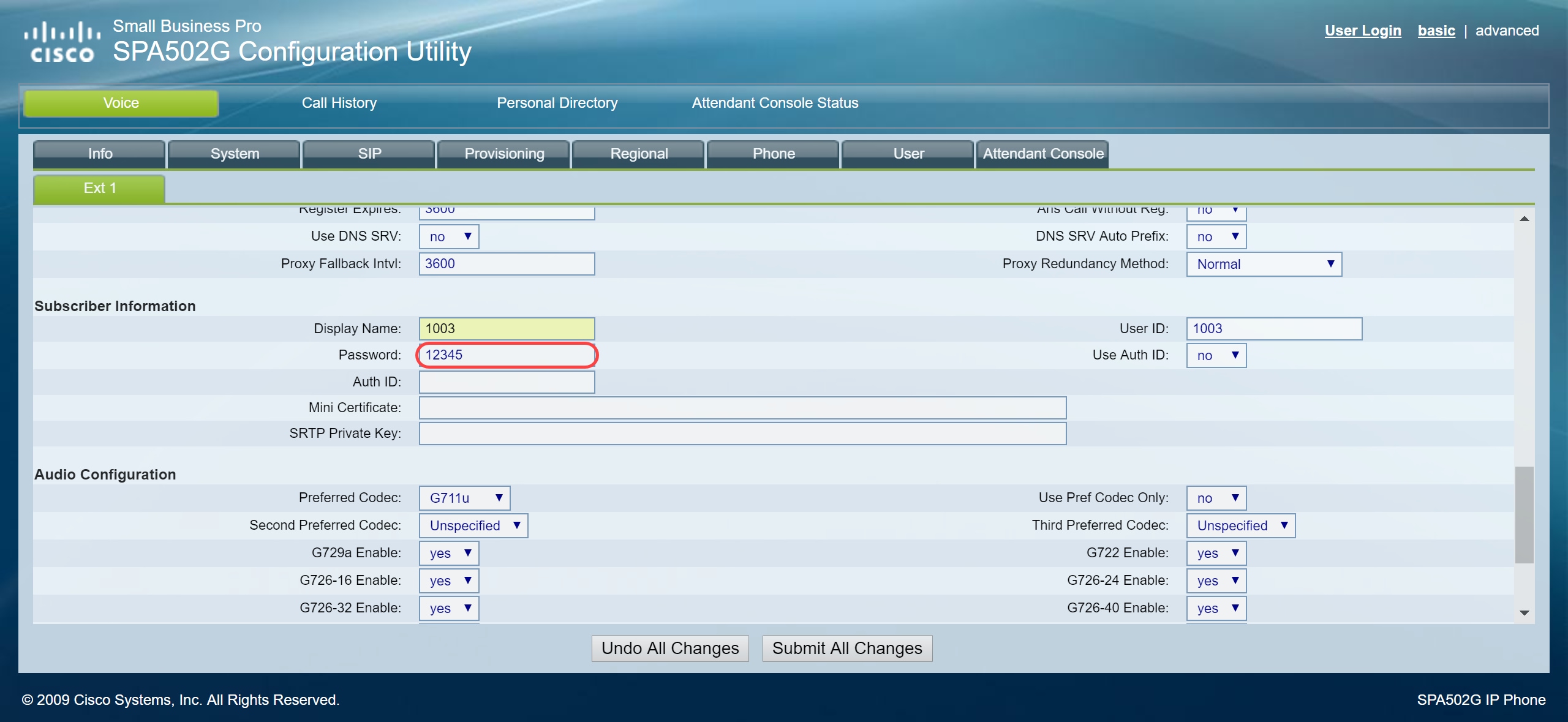 Stap 2. Navigeer naar Voice > Ext 1, de extensiepagina opent.