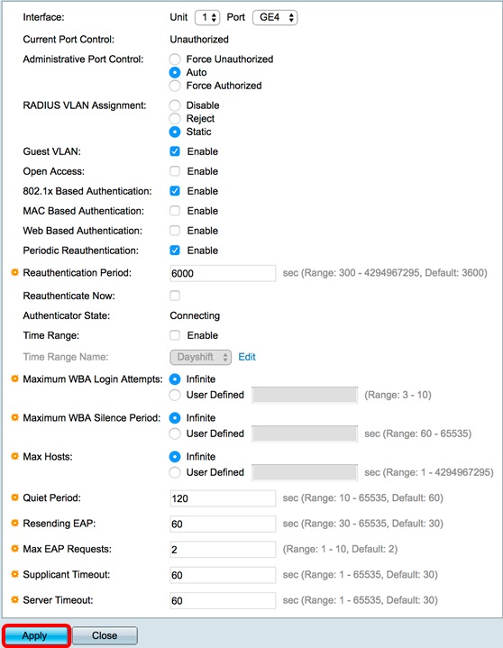 Stap 16. (Optioneel) Voer een waarde in het veld Verificatieperiode in. Deze waarde vertegenwoordigt de hoeveelheid seconden voordat de interface de poort opnieuw echt maakt. De standaardwaarde is 3600 seconden en het bereik loopt van 300 tot 4294967295 seconden.