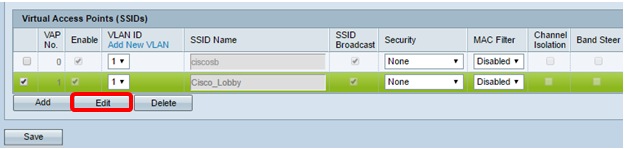 Stap 2. Onder het gebied Virtual Access Point (SSID’s) controleert u de SSID’s die u wilt configureren en klikt op de knop Bewerken hieronder.