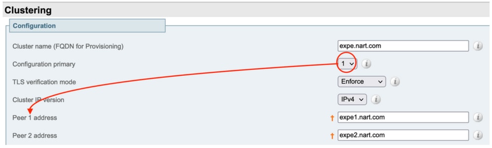 Opmerking: Zoek het menu "Primair" in Systeem > Clustering. Het nummer "Configuration primary" verwijst naar de "Primary peer" in de lijst met peers op dezelfde pagina.