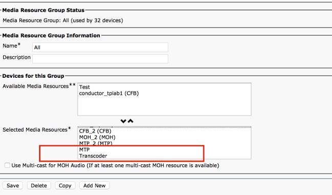 Para resolver isso, verifique a configuração do Media Resource Group/Media Resource Group List (MRG/MRGL) e verifique se o transcodificador/MTP de vídeo está disponível. Uma MRGL pode ser atribuída a um dispositivo no nível do telefone ou no nível do pool de dispositivos: