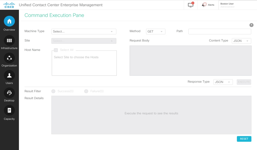 O painel Execução de Comandos fornece uma interface de cliente REST na Administração do Unified Contact Center Enterprise (CCE). Este painel permite que os administradores de sistema: