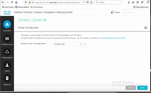 3. Na página AI do Contact Center, certifique-se de que você pode selecionar a CCAI configurada antes no Control Hub.