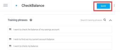 Etapa 19. Agora, prossiga com a formação do agente com todas as perguntas possíveis recebidas no sistema bancário e as respostas típicas. Crie os próximos propósitos: CheckBalance, TransferMoney. Para a intenção CheckBalance, você pode adicionar as frases de treinamento mostradas na imagem: