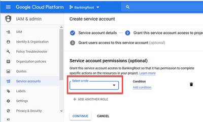 c. No pop-up, insira um nome para a conta de serviço. Nesse caso, insira BankingRootSA e clique em CREATE.