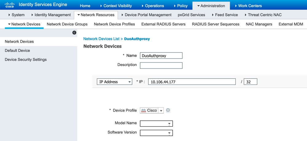 Etapa 1. Navegue para Administração > Dispositivos de rede, Clique em Adicionar para configurar o dispositivo de rede como mostrado na imagem: