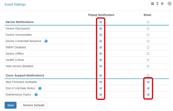 Note: Neste exemplo, todas as notificações pop-up em Notificações de dispositivo e Notificações de suporte da Cisco são ativadas, mas as notificações por e-mail são ativadas somente para Notificações de suporte da Cisco.