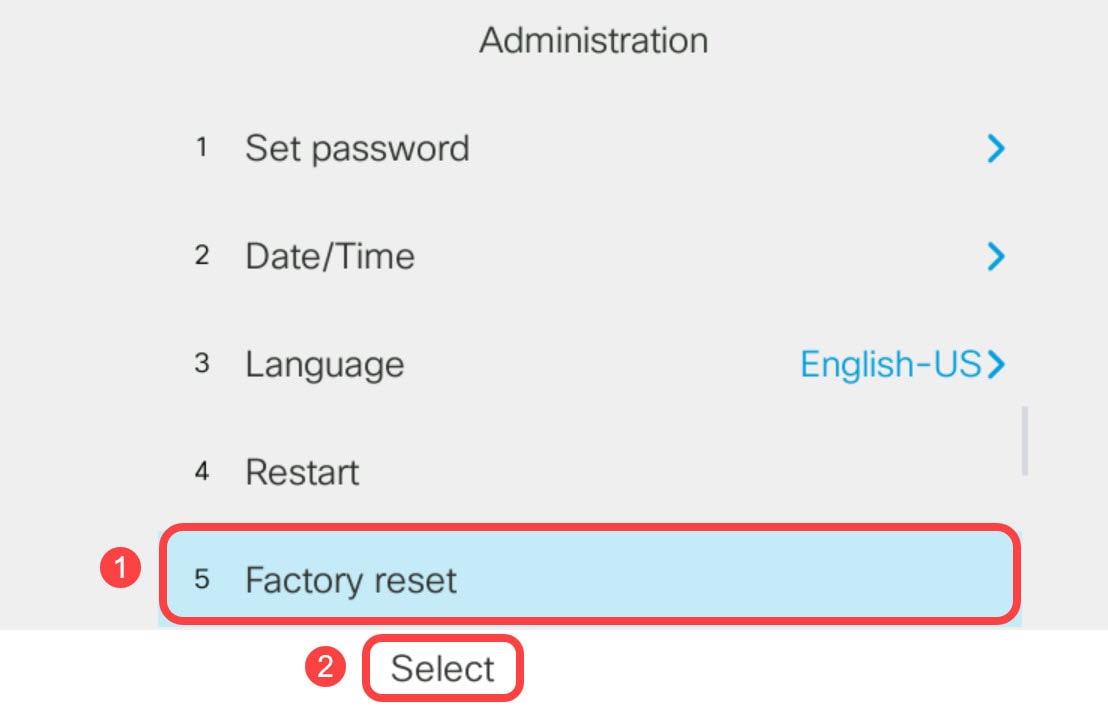 Etapa 3. Role para baixo e selecione Fatory Reset > Select (Redefinição de fábrica > Selecionar).