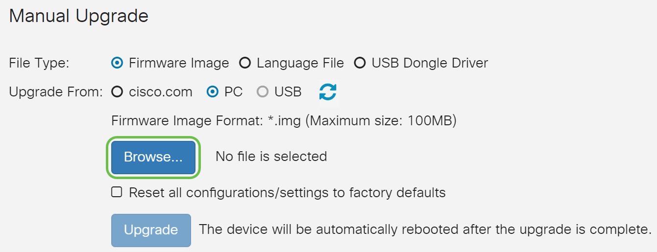 Etapa 3. Na seção Atualização manual, clique no botão de opção Imagem do firmware para Tipo de arquivo.