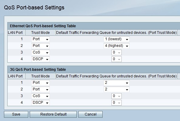 Etapa 2. Na lista suspensa Modo de confiança, escolha um modo de confiança para cada porta de LAN. O modo de confiança determina como o tráfego de rede será enviado para as filas.