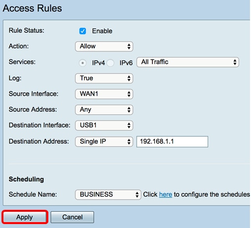 Etapa 12. No menu suspenso Interface de destino, escolha uma interface para o tráfego de saída ou de saída onde a política de acesso deve ser aplicada. As opções são WAN1, WAN2, USB1, USB2, VLAN1 e Any.