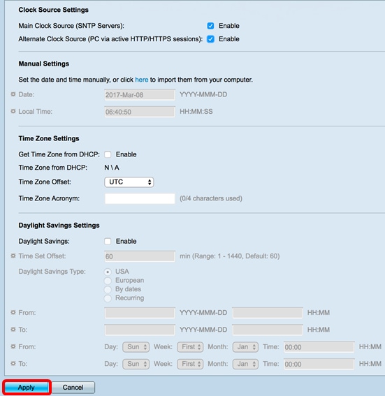 Etapa 2. (Opcional) Na área Alternate Clock Source (PC via sessões HTTP/HTTPS ativas), marque a caixa de seleção Enable para definir a data e a hora da configuração do computador usando o Hypertext Transfer Protocol (HTTP).