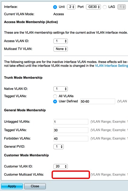 As seguintes configurações são para os modos de VLAN da interface inativa. Esses efeitos serão salvos, mas não entrarão em vigor até que o modo VLAN da interface seja alterado na página Configurações da interface VLAN. Para saber mais sobre como configurar este recurso, clique aqui para obter instruções.