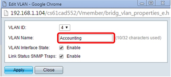 Etapa 5.No campo Nome da VLAN, digite um nome para a VLAN. Para este exemplo, o Nome da VLAN será Contabilidade. Podem ser usados até 32 caracteres.