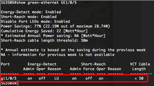 Note: Neste exemplo, o comando show green-ethernet GE1/0/5 é usado.