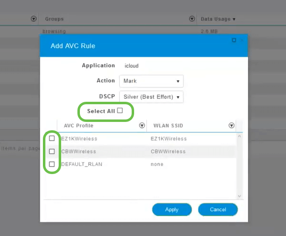 Agora selecione o SSID individual que você deseja que esta política execute. Ou, opcionalmente, clique em Selecionar tudo.