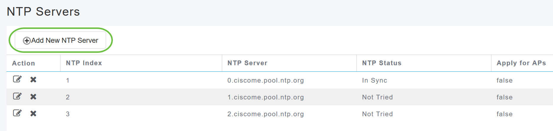 Para editar um servidor NTP existente, clique no ícone adjacente Editar.