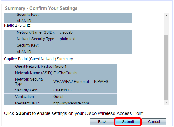 Etapa 12. Verifique as configurações definidas na tela Resumo - Confirmar suas configurações. Se desejar alterar uma configuração, clique no botão Voltar até que a página desejada seja alcançada. Caso contrário, clique em Enviar para habilitar suas configurações no WAP.