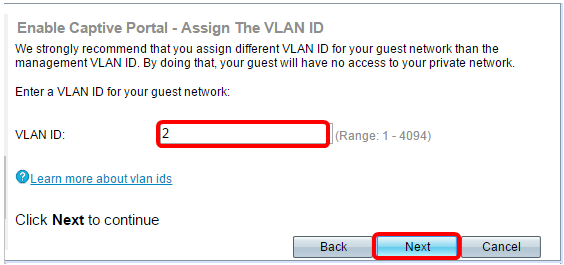 Etapa 9. Na área Enable Captive Portal - Assign The VLAN ID (Ativar portal cativo - Atribuir a ID da VLAN), digite a ID da VLAN para a rede de convidado e clique em Next (Avançar). O intervalo de ID da VLAN é de 1 a 4094.