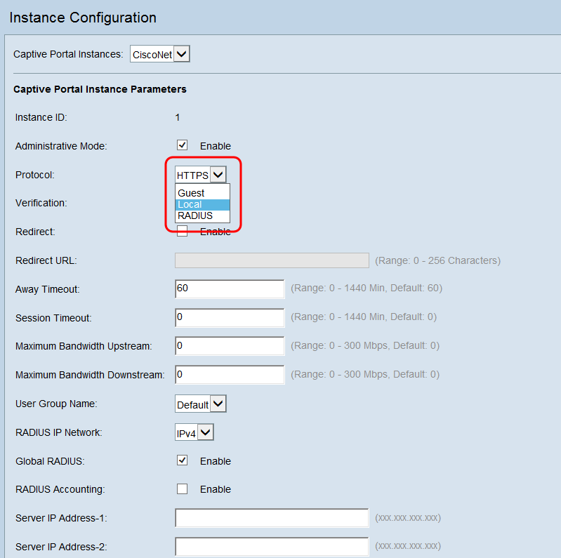 Etapa 1. Navegue até Captive Portal > Instance Configuration. A tela Instance Configuration é exibida: