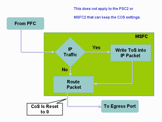 Todos os pacotes que vêm do MSFC1 ou do MSFC2 têm um CoS de 0. O pacote pode ser um pacote roteado por software ou um pacote que o MSFC emita. Essa é uma limitação do PFC porque ele redefine o CoS de todos os pacotes que vêm do MSFC. O DSCP e a precedência de IP ainda são mantidos. O PFC2 não tem essa limitação. O CoS existente do PFC2 é igual à precedência IP do pacote.