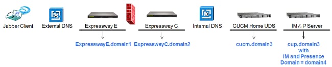 O usuário sempre faz logon com userid@domain4, já que não deve haver nenhuma diferença na experiência do usuário quando dentro ou fora do ambiente do usuário. Isso significa que se domain1 é diferente de domain4, você deve configurar o domínio de serviços de voz no cliente Jabber. Isso ocorre porque a parte do domínio do logon é usada para descobrir os serviços de borda de colaboração pelo uso de pesquisas no registro de serviço (SRV).