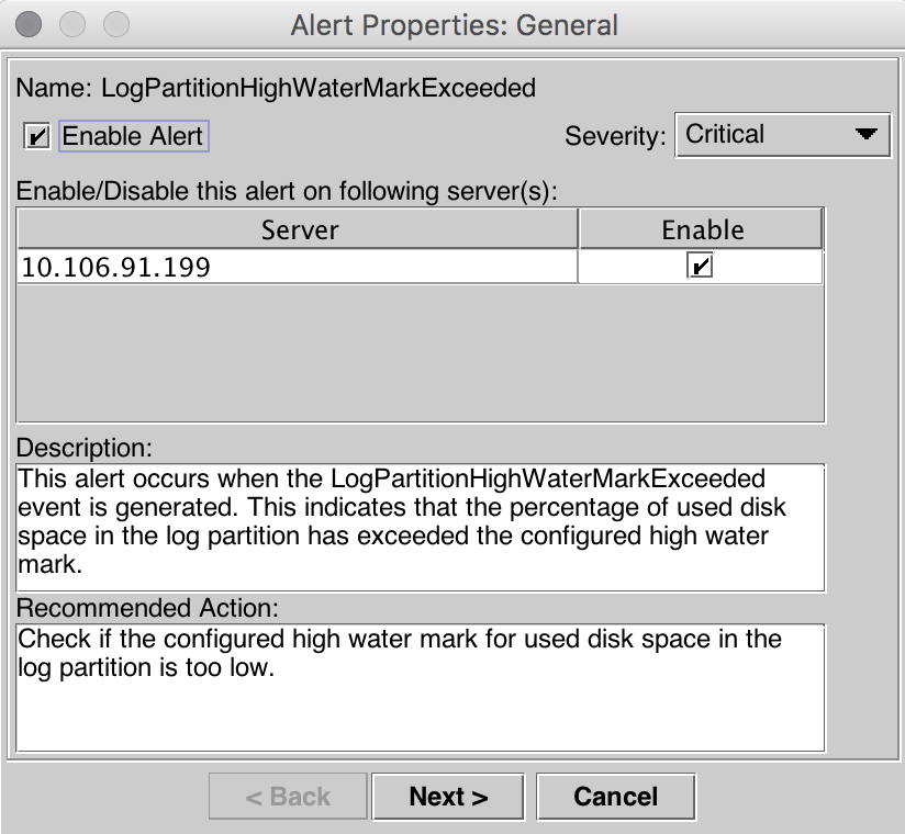 No painel direito, em System Right, clique em LogPartitionLowWaterMarkExceeded > Set Alert/Properties.