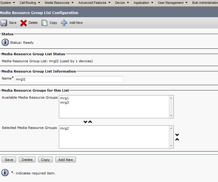 Conclua estes passos para configurar seus MRG/MRGLs depois que você tiver seus recursos de mídia configurados no Cisco CallManager.