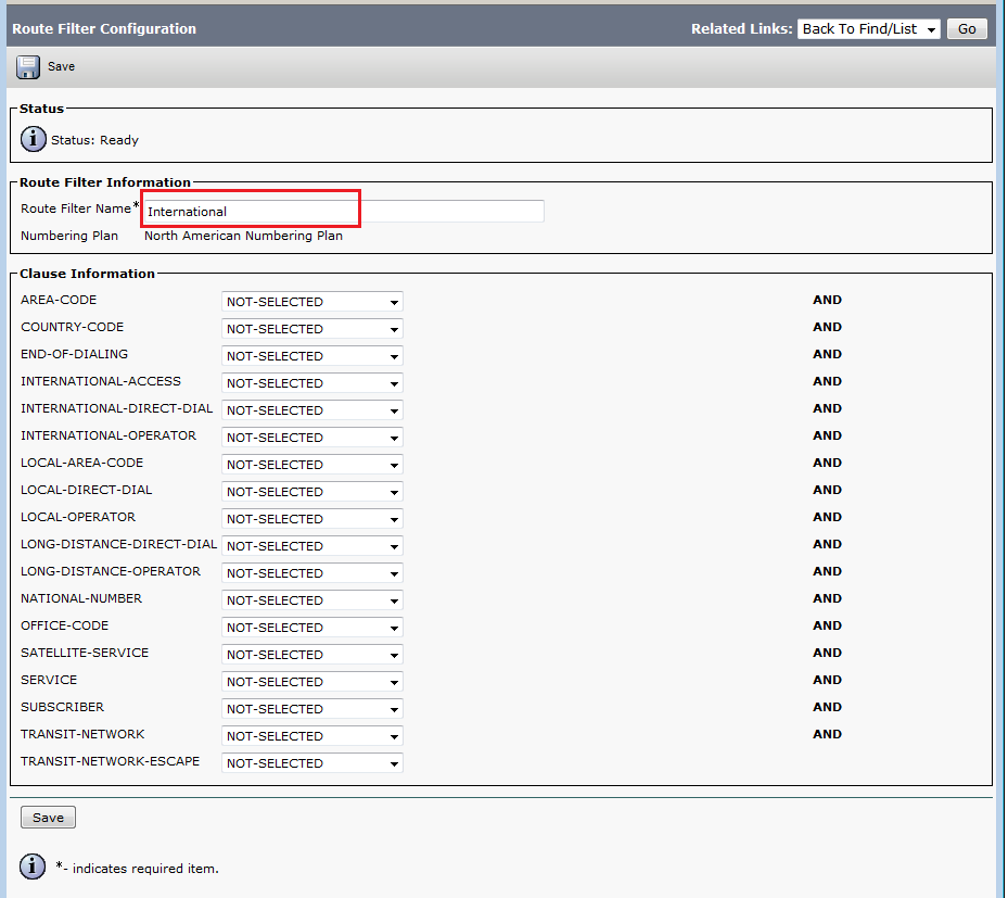 Neste filtro de rota, escolha o valor "DOES-NOT-EXIST" para a cláusula International-Access. Depois de aplicar o filtro de rota ao padrão de rota, todas as chamadas internacionais serão bloqueadas. Para entender melhor cada cláusula e seu impacto, use o link Ajuda > Esta página no menu superior quando estiver na página de configuração do filtro de rota.