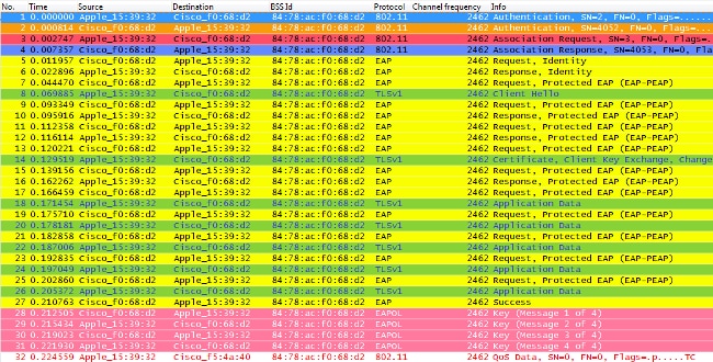 Observação: se você deseja aprender sobre farejamento sem fio 802.11 e sobre os filtros/cores usados no Wireshark para as imagens que aparecem neste documento, visite a publicação da Comunidade de Suporte da Cisco chamada Análise de Imagem do Sniffer 802.11.