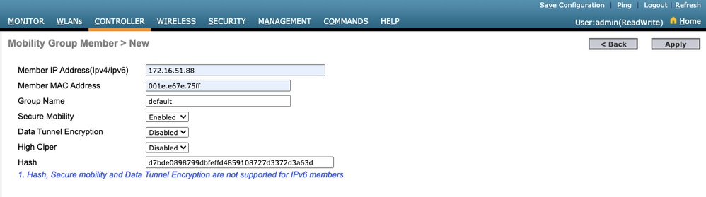 Navegue até CONTROLLER > Mobility Management > Mobility Groups > New.