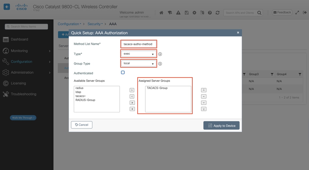 WLC-9800(config)#aaa authorization exec tacacs-autho-method local group TACACS-Group
