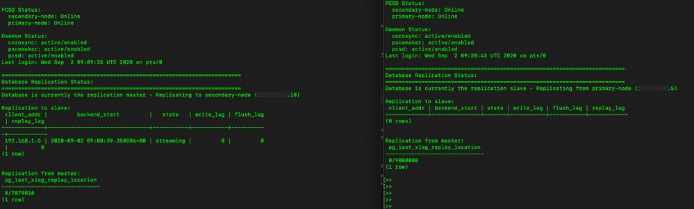9.群集HA状态显示,左侧主服务器的数据库(复制主服务器)按照预期复制到右侧辅助服务器的数据库(复制从服务器)。