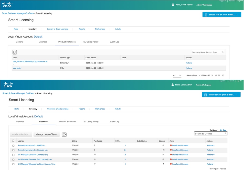 11.两个新产品实例(pi37)和(cucm-pub-30)注册到SSM On-Prem的VIP地址,如“产品实例”(Product Instances)选项卡所示。