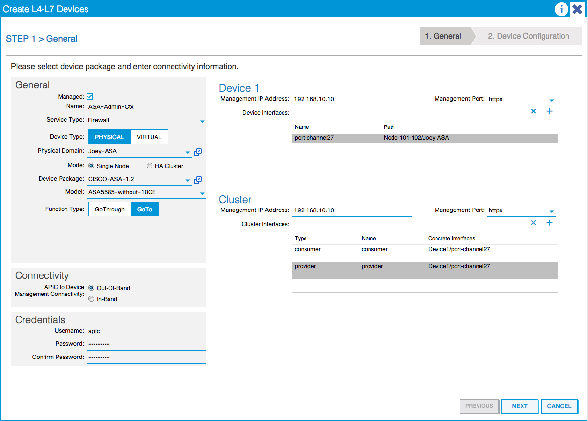 您必须将ASA管理情景和用户情景添加到APIC。要完成此操作,请导航至Tenant > L4-L7 Services > L4-L7 Devices,右键单击并选择Create an L4-L7 Device,然后完成以下步骤: