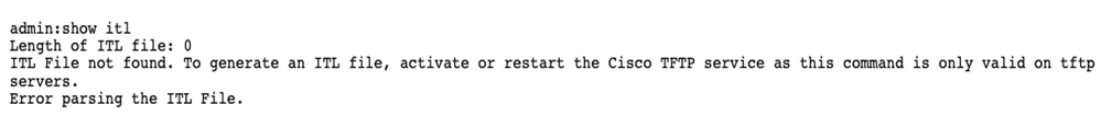 - ITL损坏的问题。发生这种情况时,设备会失去其受信任状态,并且需要从CUCM发布方运行utils reset localkey命令,强制电话现在使用ITLRecovery证书。如果集群处于混合模式,则需要使用命令utils ctl reset localkey。接下来,您将看到一个示例,说明您尝试从CUCM的CLI查看损坏的ITL时能看到的内容。如果您尝试查看ITL并尝试运行utils itl reset localkey命令时出现错误,但您看到第二个错误,则可能是思科漏洞ID CSCus33755的缺陷。请确认CUCM的版本是否受到影响。
