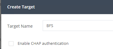 在本配置示例中,我们不使用身份验证。 提供 目标名称 没有_的名字 (下划线) 或 other(其他) 特殊字符。 在这些示例中,未配置CHAP身份验证。出于安全原因,可以配置CHAP身份验证。 在在BootFromSAN LUN上安装Windows OS和ESXi的示例中,配置了CHAP身份验证。