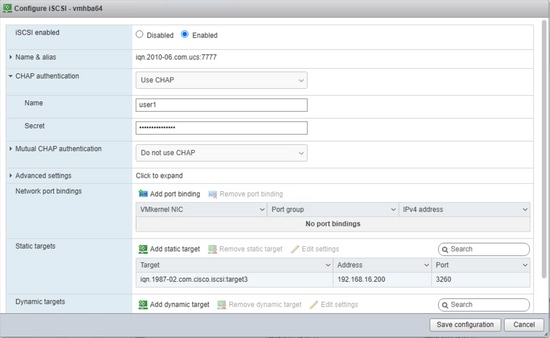 步骤7.在“配置iSCSI”屏幕的CHAP身份验证中,使用CHAP并从HX存储中输入相同的CHAP凭据,如下图所示: