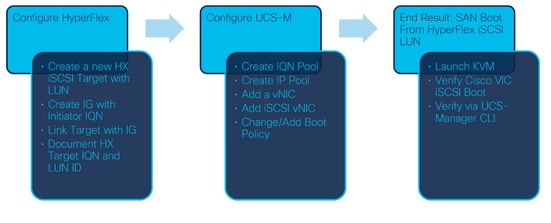 从HyperFlex iSCSI LUN配置SAN引导所需执行的步骤如下图所示: