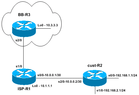 小型ISP(ISP-R1)为其中一个用户分配了一个网络块192.168.0.0/16。在本例中,用户将192.168.0.0/16划分为/24网络,此时仅使用192.168.1.0/24和192.168.2.0/24。在路由器ISP-R1上,ISP为192.168.0.0/16配置通往用户路由器(cust-R2)的静态路由。 然后,ISP连接到由路由器BB-R3代表的主干ISP。路由器BB-R3向ISP-R1发送默认路由,并通过BGP从ISP-R1接收网络192.168.0.0/16。